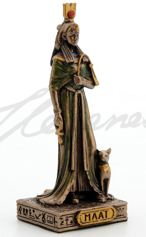 Maat is the Egyptian goddess of truth, justice, harmony, balance, and order. She is often depicted as a young woman with an ostrich feather on her head or wings on each arm. Maat is the daughter of the sun god Ra and was created when Ra arose from the waters of Nun (chaos). She was the devoted wife of Thoth (the god of wisdom). Ancient legends state that when a person dies, Maat uses a scale and her feather to weigh their heart. If the heart is pure, the scale will remain balanced with the feather and the soul will be sent to Osiris (the god of the underworld). If the heart is evil and is not in balance with the feather of truth, the soul is sent to Ammut to be devoured. There are 42 ideals (laws) of Maat that form the core principles of morality and justice.